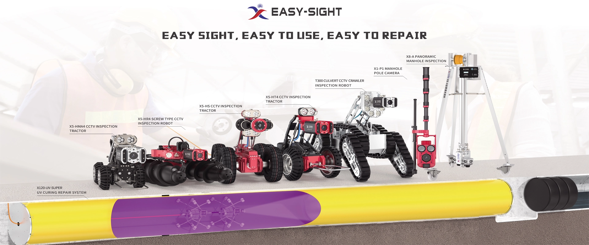 Zu den Hauptprodukten von Easy Sight gehören das Rohr periskop (Quick view), CCTV-Inspektions roboter, Rohrsonar systeme, Sonar-CCTV-Systeme, Schubstangen kameras, Video-Jetting-Düse und UV-Härtung sanierungs systeme. 3D-Schacht scanner, GIS-Daten managements ysteme und so weiter.